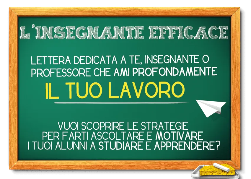 Per questo è nato “L’Insegnante Efficace”: un videocorso pratico per insegnanti che ti guiderà passo dopo passo a trasformare le tue lezioni in esperienze ispirazionali, QUALUNQUE SIA LA MATERIA CHE INSEGNI.